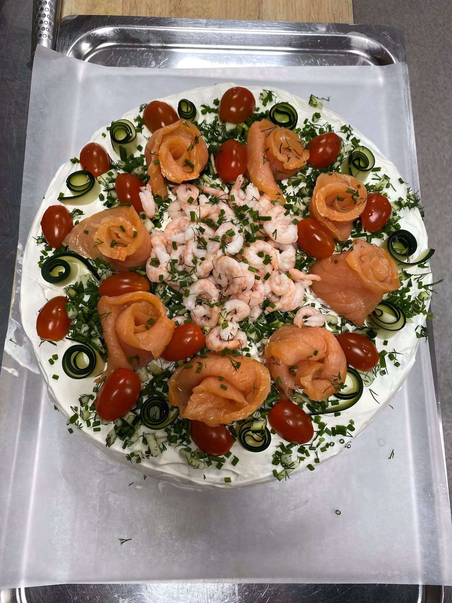 En fyllning med räkfyllning, äggkremé toppas med handskalade räkor och kallrökt lax.Förbokas 3 vardagar innan: